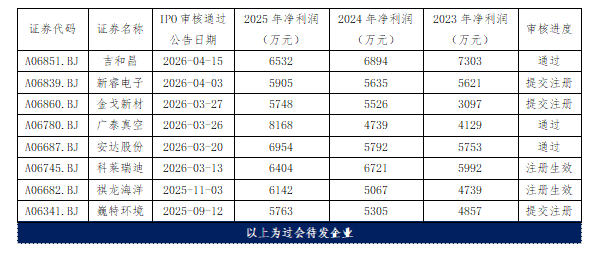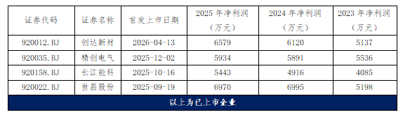 从审核实践观察,2025年以来已有多家利润规模相近的企业成功登陆北交所:2025年9月上市的世昌股份,2024年净利润约6995万元;2026年4月上市的新睿电子,2025年净利润为5905万元。这些案例表明,5000万—7000万元利润区间正成为北交所新上市企业的常见水平。