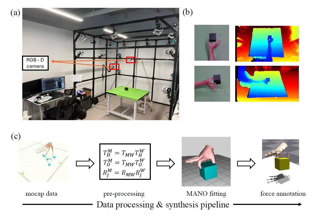 基于Cutkosky抓取分类学,研究团队系统设计了22类操作模式,覆盖从精密捏取(如针线操作)到力量抓握(如提拉重物)的完整空间。通过高精度动捕系统,实现亚毫米级轨迹记录精度,同步采集RGB、深度、动作轨迹等多模态数据,为物理反演提供丰富输入。
