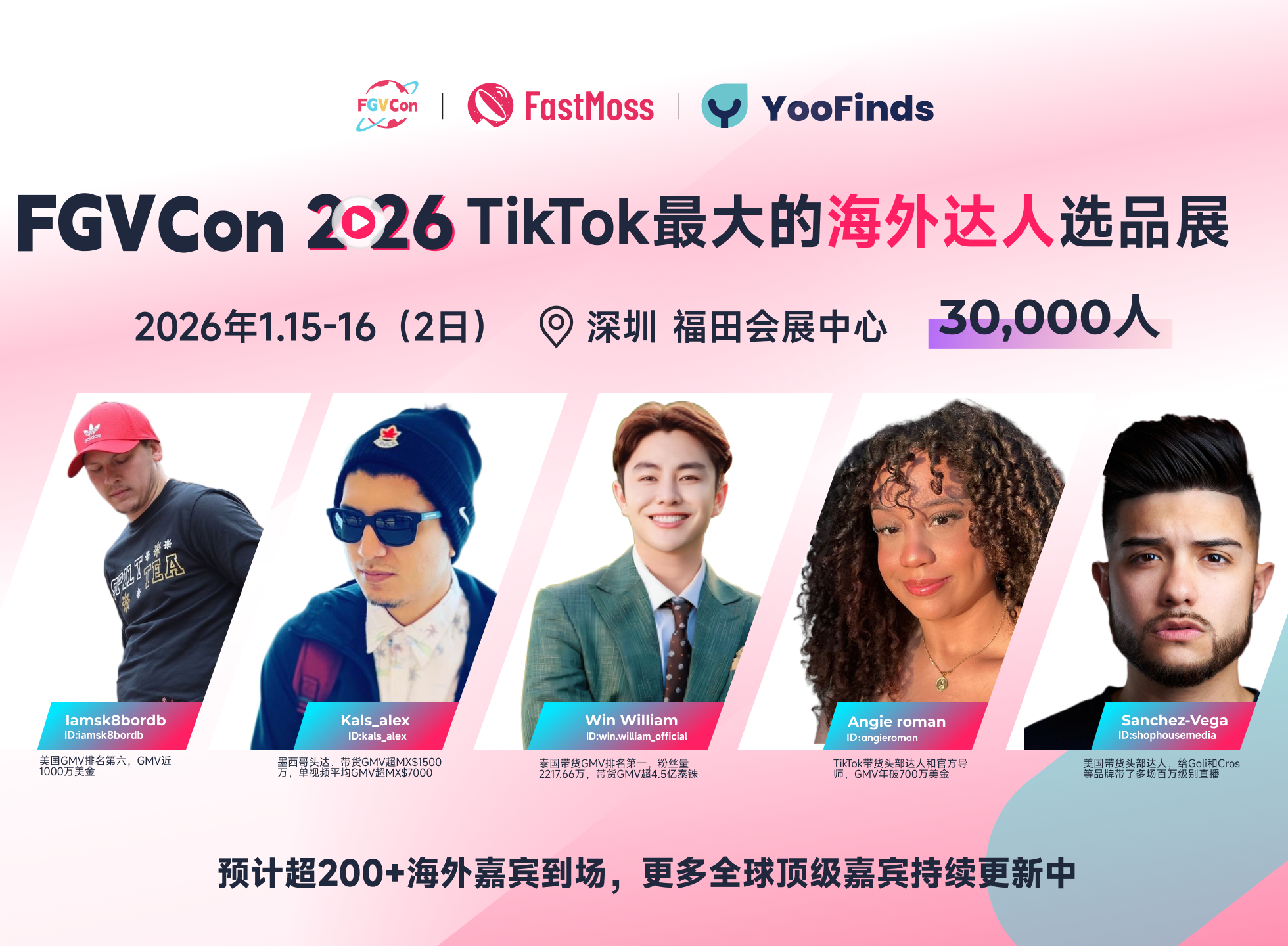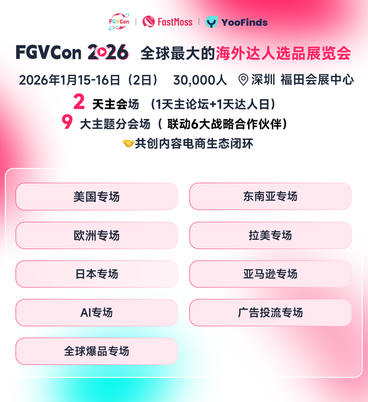 在2026 第四届 FGVCon 展览会,FastMoss不仅将继续打造 TikTok 行业最大规模的线下展会,我们还将特别邀请来自 15 个国家、横跨 TikTok、Facebook、YouTube Shorts、Instagram Reels、独立站、亚马逊等多个平台的 1000+ 海外达人、头部商家与行业机构代表,在为期2天,30,000+参会者面前,展开深度对话,共同解读和共同分解,去解读我们观察到的正在悄然发生六大关键变化。