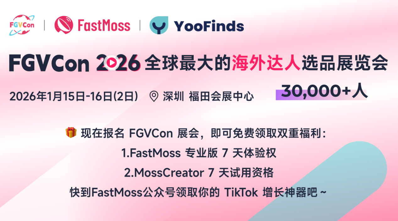 面向TikTok 电商全球扩张浪潮所带来的六大关键变量,第四届FGVCon 2026 将在去年的版本上全面升级。本届大会由 FastMoss 与美国最大的选品平台 YooFinds 联合主办,将于2026 年1月15-16日(为期2天,共30,000人)在深圳福田会展中心举办。围绕“人、货、场”的深度重构与高效链接,FGVCon 2026 将汇聚来自 15 个国家的头部达人、品牌商家与平台机构,预计海外参会者超 1000+,打造涵盖 TikTok、YouTube Shorts、Instagram Reels、Facebook 等多个主流短视频平台的全球最大内容电商展览会。