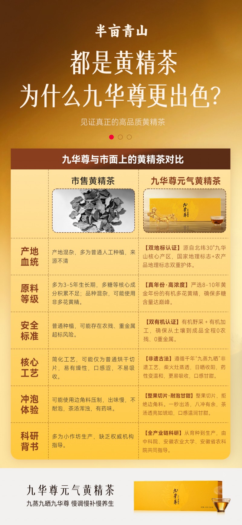 如果说告别传统养生方式是第一步,那么九华尊在与普通黄精茶的对比中,则展现出基于千年传承的“降维打击”,从六大维度树立行业标杆。