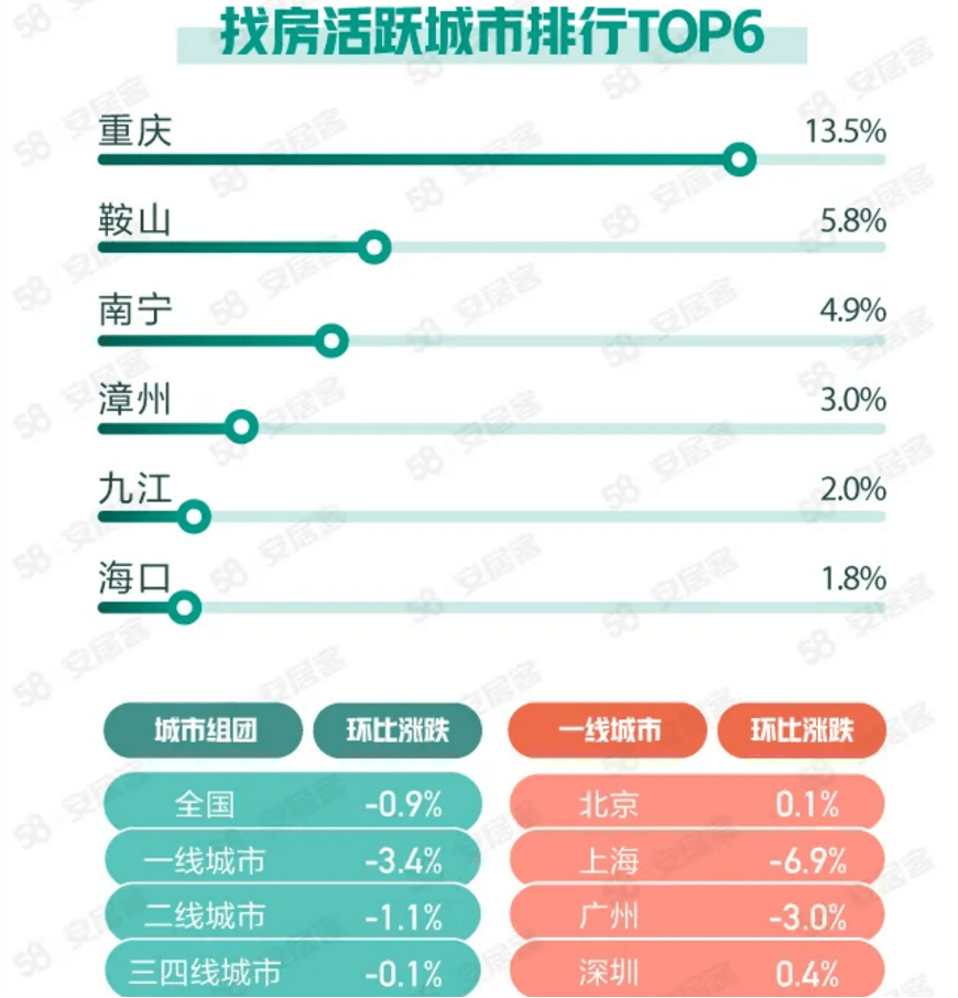 58安居客房产研究院监测数据显示,5月新房找房热度有小幅波动,但总体基本保持平稳,全国找房热度环比微跌0.9%。其中,一线城市找房热度环比下跌3.4%,二线城市找房热度环比下跌1.1%,三四线城市找房热度下跌0.1%。找房活跃城市排行前五的城市分别是重庆、鞍山、南宁、漳州和九江。