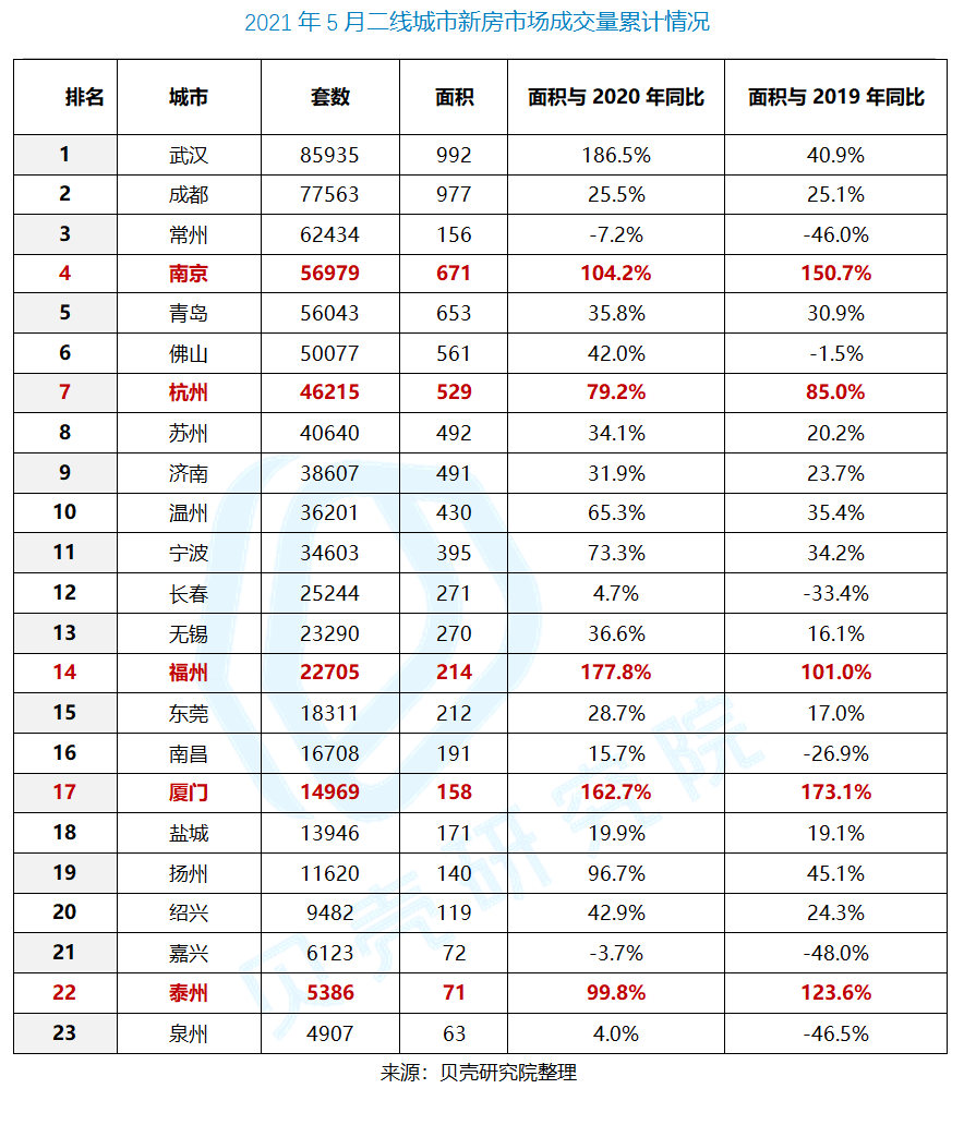 然而,与全国整体发展趋势相一致,各二线城市新房市场增速同样出现下滑,但南京、杭州、福州、厦门、泰州等全国重点区域的强二线城市,今年1-5月的成交面积同比均有80%以上的增长,市场活跃度保持较好,成交面积累计增长幅度超越一线城市。