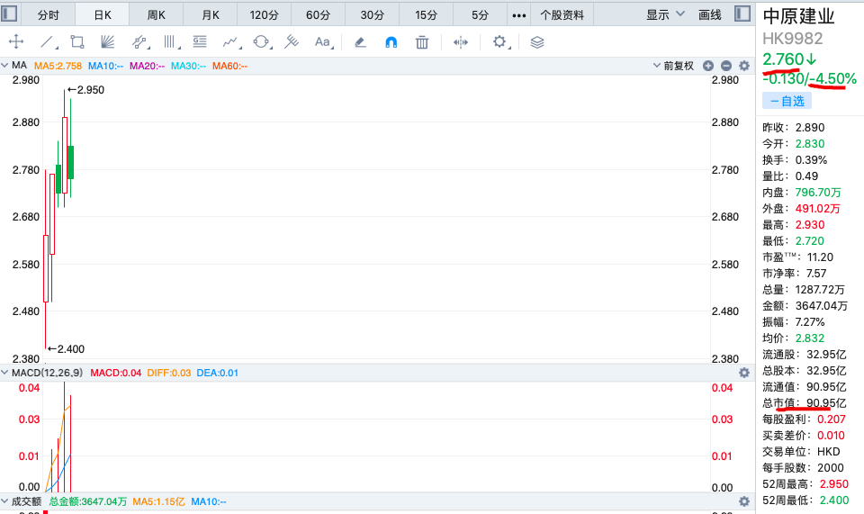 中网财经此前报道称,中原建业在上市首日开盘时遭遇休市。当日中原建业的开盘价为每股2.5港元,较每股3港元的发行价下跌16.7%。截至6月4日13.30,中原建业每股2.76港元,盘中下跌4.5%,总市值90.95亿港元。