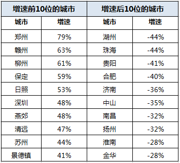 在城市方面,截至4月底,100个城市中有51个城市的库存同比呈正增长,其余49个城市的库存同比呈下降趋势。具体城市来说,郑州库存同比增长最为明显,增速为79%;湖州下降最为明显,下降了44%。