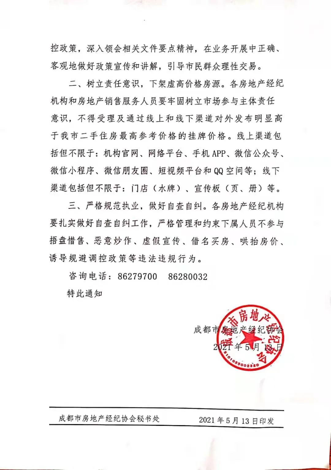 《通知》要求假高价的房子下架。各房地产经纪机构和房地产销售服务人员要牢固树立市场参与者的责任感,不得通过线上线下渠道接受或发布明显高于成都市二手房最高参考价格的挂牌价格。在线渠道包括但不限于:机构官网、网络平台、手机APP、微信微信官方账号、微信小程序、微信朋友圈、短视频平台、QQ空间;线下渠道包括但不限于:店铺(水卡)、宣传板(页面、小册子)等。