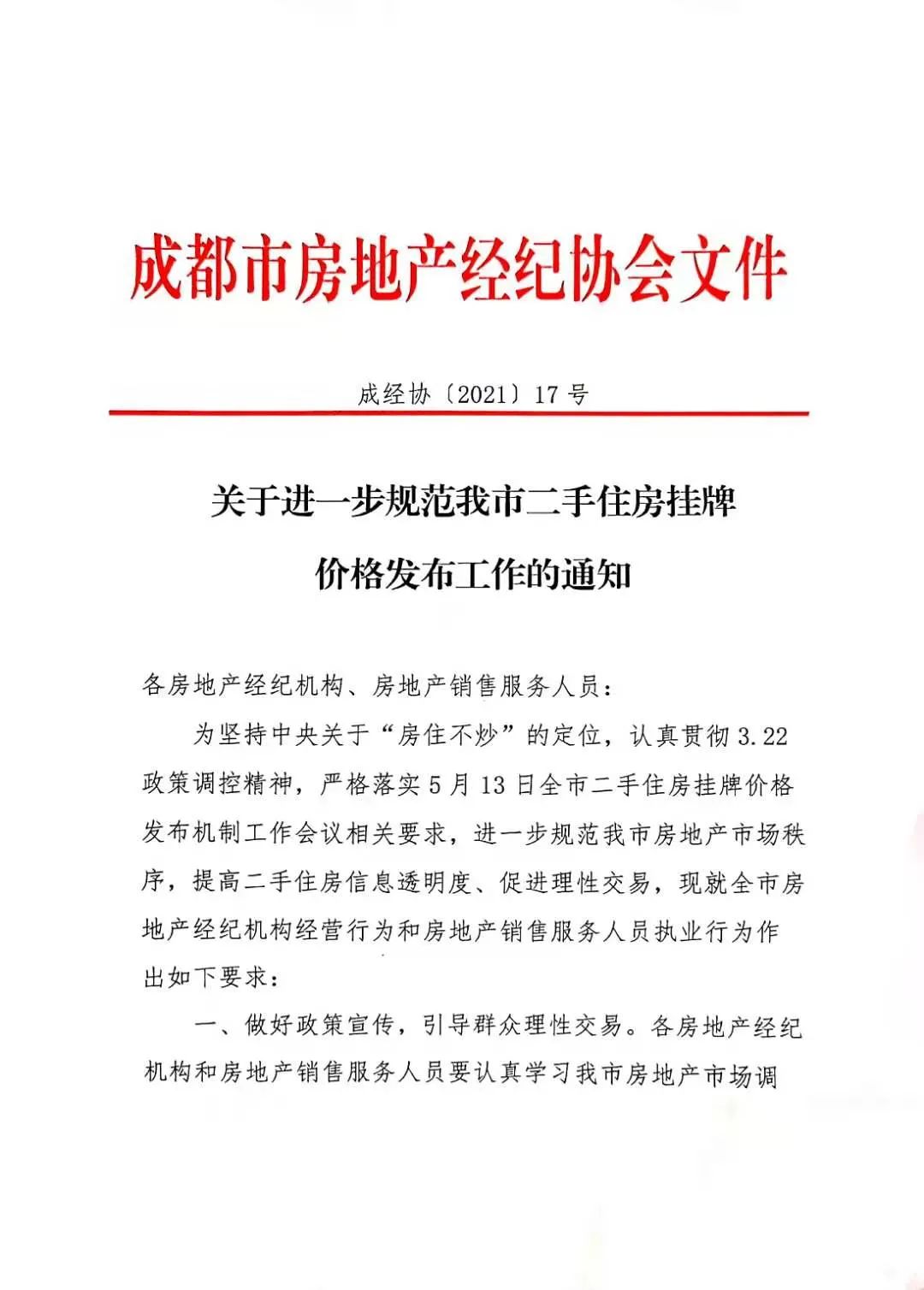 5月14日电:据悉,成都市房地产经纪人协会在其官方微发布《关于进一步规范我市二手住房挂牌价格发布工作的通知》中指出,严格执行5月13日全市二手房挂牌价格发布机制工作会议的相关要求,进一步规范了成都市房地产市场秩序,提高了二手房信息透明度,促进了理性交易,现已对房地产经纪人的经营行为和全市房地产销售服务人员的执业行为做出了具体要求。