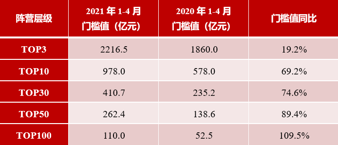 2021年1-4月TOP100各阵营销售额门槛值情况