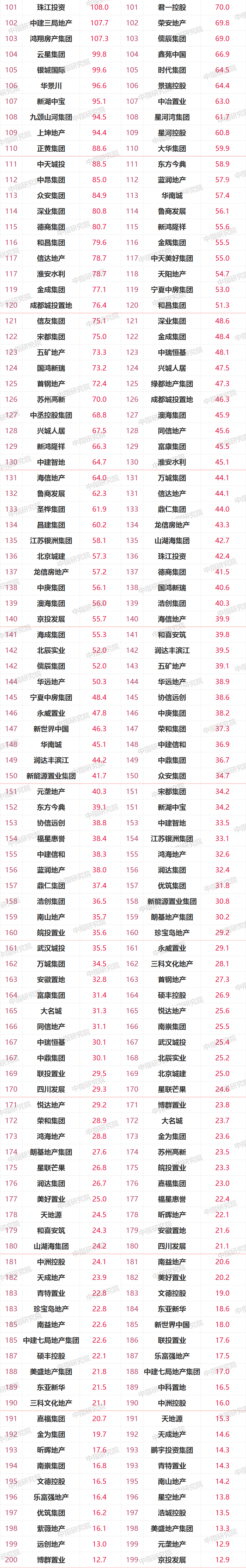 其中,TOP100房企销售额均值为426.6亿元,增长率均值为88.4%;其中销售额超千亿房企9家,较去年同期增加5家;超百亿房企103家。TOP100房企权益销售额均值为314.8亿元,权益销售面积均值为224.8万平方米。TOP101-200房企销售额均值为50.3亿元。
