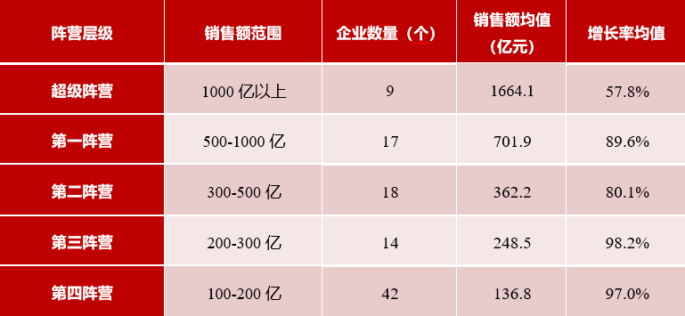 2021年1-4月,房企不同阵营的发展分化。1000亿以上超级阵营共9家,销售额增长率均值为57.8%。第一阵营(500-1000亿)共17家,销售额增长率均值为89.6%。第二阵营(200-500亿)有18家企业,销售额增长率均值为80.1%;第三阵营(100-200亿)和第四阵营分别为14家和42家,销售额均值分别为248.5亿元和136.8亿,同比分别增长98.2%和97.0%。