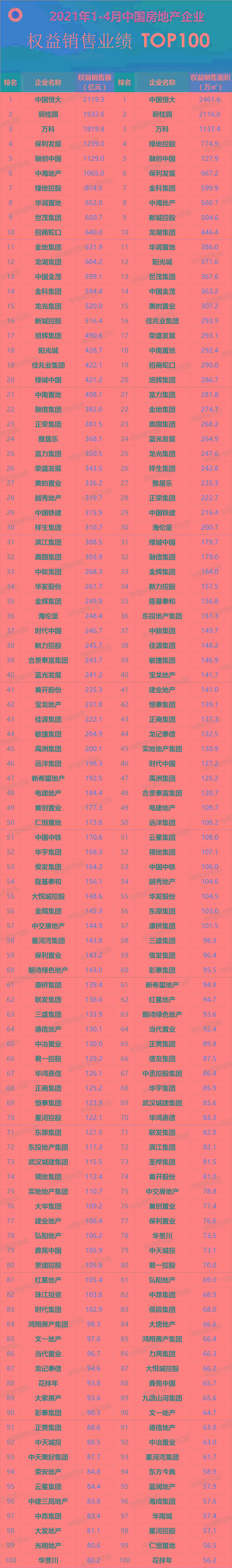 特别声明:房地产企业权益销售数据统计是以2021年1月1日-4月30日期间按股权比例销售的商品房为统计口径,主要依据CREIS中指数据在各地的销售监测数据,并参考当期总体经营情况和推盘去化情况进行分析统计;对于少数没有在监测范围内的城市或项目,由企业提供相关证明文件,经课题组对数据进行严格审核,也纳入统计范围。本报告仅供参考,课题组不对使用报告及其内容所引发的任何直接或间接损失承担责任。