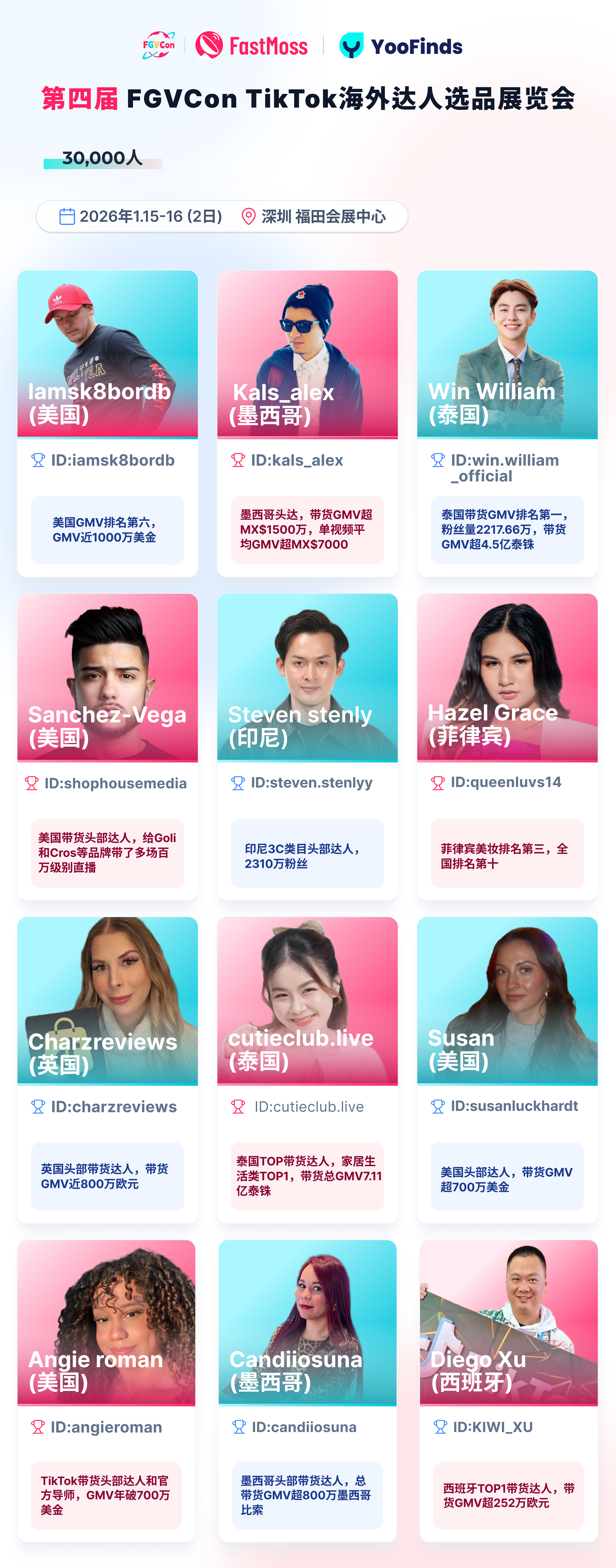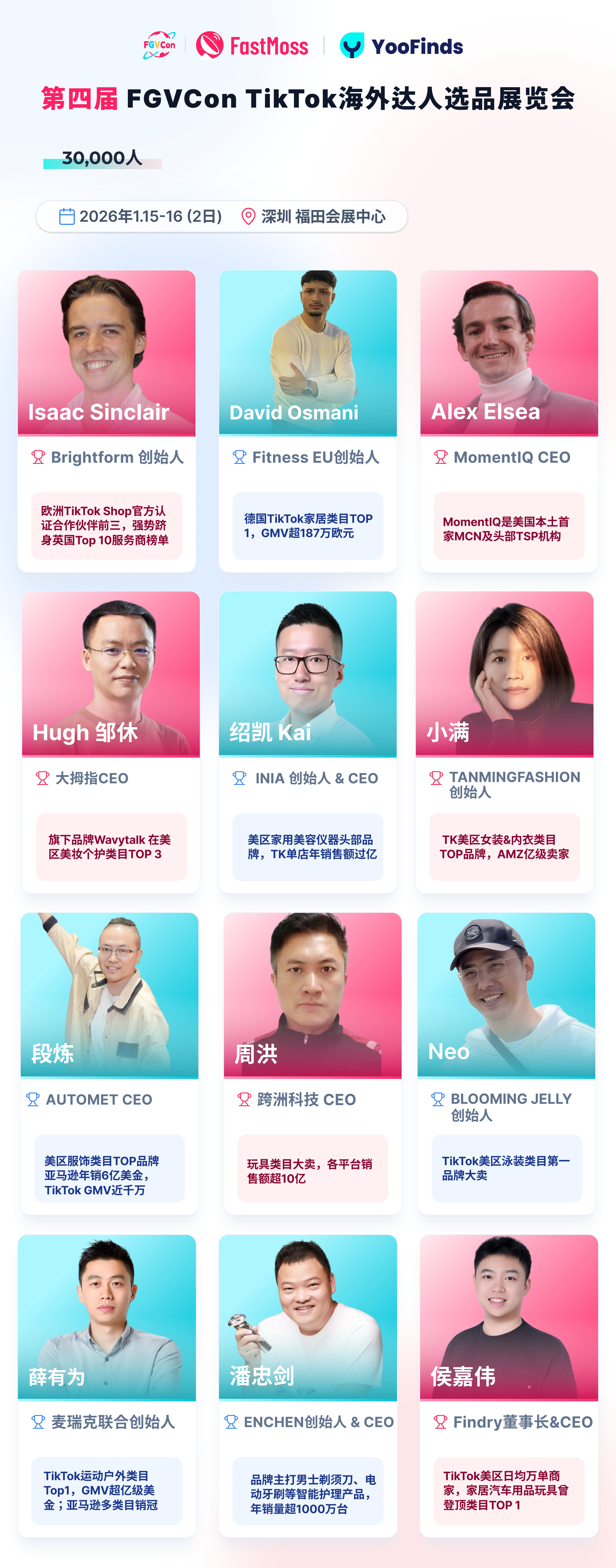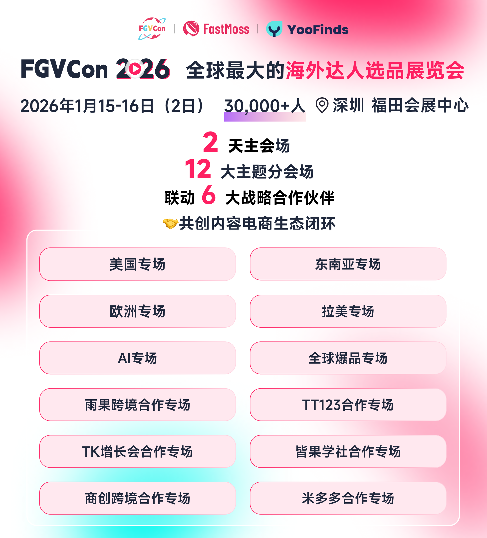 由全球最大的 TikTok 数据分析平台 FastMoss 联合美国本土知名达人选品平台 YooFinds 主办的 第四届 FGVCon 海外达人选品展览会,今日正式发布大会首批议程议题。作为全球规模最大、影响力最强的 TikTok 达人选品盛会,FGVCon 2026 在嘉宾数量、嘉宾质量、议题高度以及报名人数上全面刷新纪录。展览会将于 2026 年 1 月 15–16 日 在 深圳福田会展中心 6、7、8 号馆 盛大举办。目前已确认近200 位来自全球的重磅嘉宾出席分享,涵盖30+海外头部带货达人、80+全球顶级商家(还有更多嘉宾正在陆续确认中),预计将迎来超过1000 位来自全球的海外参会者,其中包括预计超 200 位 TikTok 达人,以及众多来自全球的本土化卖家、本土化机构与分销渠道代表,共同探讨 TikTok 电商的全球化发展与本地化落地策略。在为期两天的展览会中,除了线下展区的产品展示与交流外,大会还将设有全天主会场论坛与覆盖不同区域和主题的 12 大分会场专场。内容将围绕 TikTok 电商在全球的发展路径,涵盖美国、东南亚的直播爆发、新开的日/欧五国/拉美市场的打法解析。15国嘉宾将就选品逻辑、内容变现、直播增长、平台政策变化、跨市场复制等关键方向展开系统性的深度探讨。