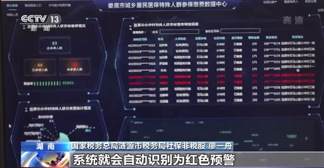 国家税务总局涟源市税务局社保非税股廖一舟:在我们集中征缴期内,困难群众如果没有及时参保,系统就会自动识别为红色预警。我们每天都会根据最新的预警情况,向乡镇基层发布未缴费人员名单,督促参保缴费。