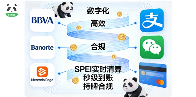 熊猫速汇深度接入墨西哥SPEI银行间实时清算系统,支持BBVA、Banorte、Santander等主流银行以及Mercado Pago等数字钱包,无需奔波线下网点,资金快速对接国内收款账户,支付宝、微信、银行卡均可实现秒级到账。