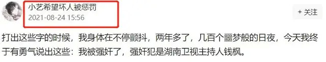 就在24日下午3点左右,《天天向上》另一位主持人王一博被粉丝拍到上班,钱枫应该也在,而小艺长文发布时间就在15点56分……最后也希望事件真相早日能调查清楚吧!(原标题:女网友举报钱枫性侵:自曝曾怕被网暴 想让钱枫经受我的痛苦)