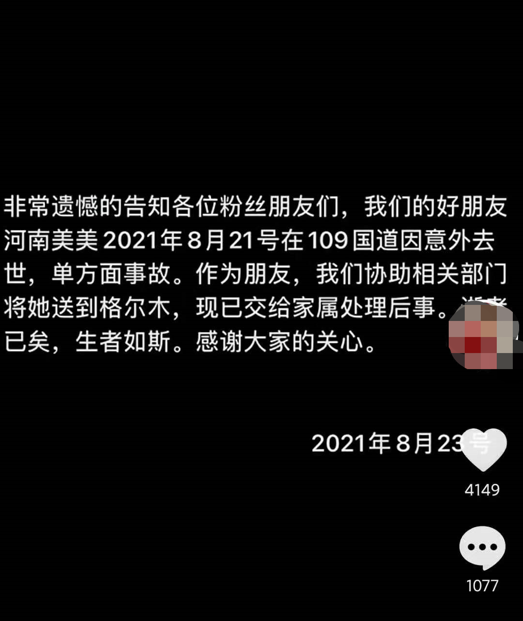 针对“河南徒步者在109国道青藏线不幸身亡”一事,8月24日,记者从权威部门获悉,该女子确认已经遇难。目前,交警部门正在处理,其遗体已被送到格尔木市。