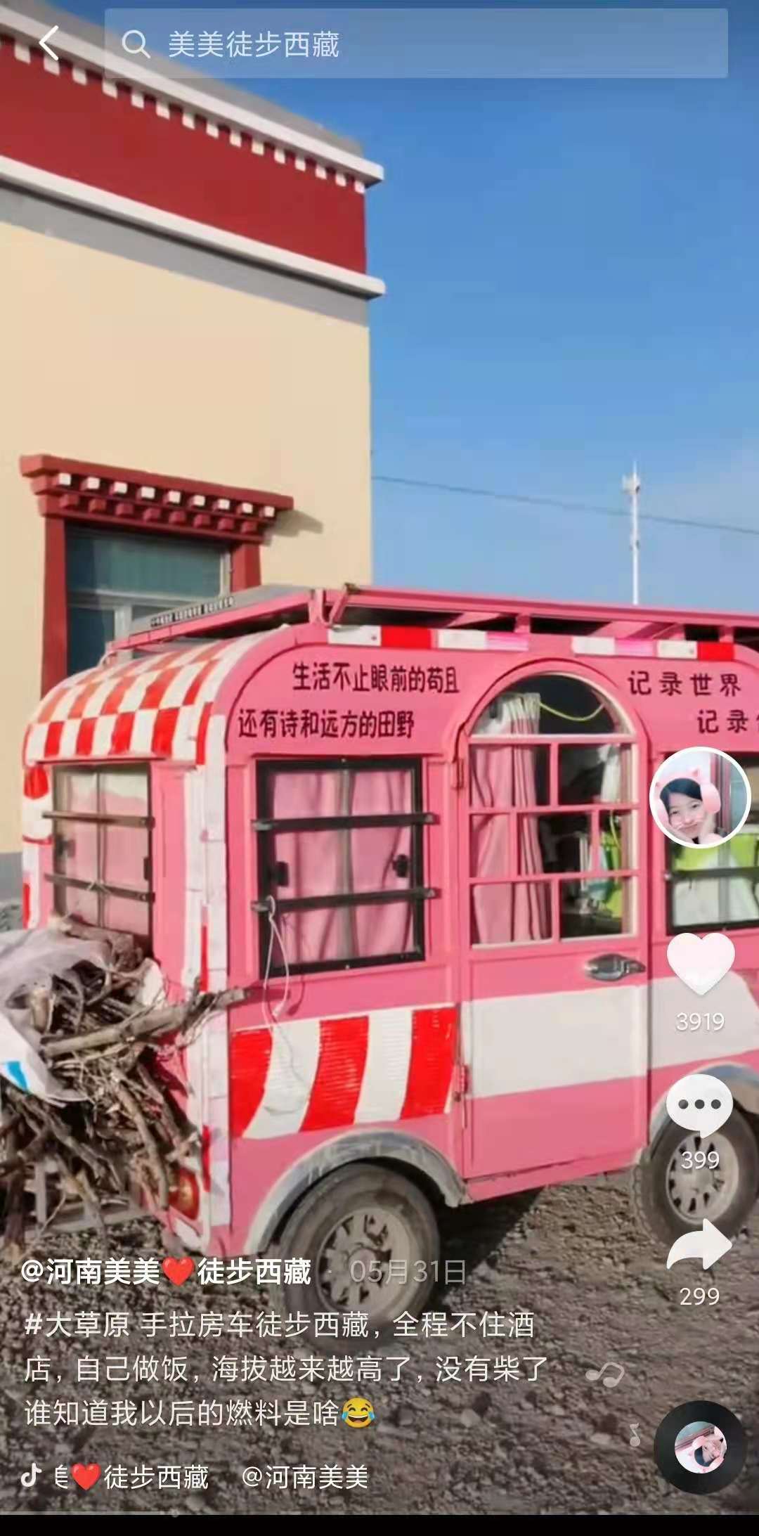 “河南美美徒步西藏”抖音用户首页介绍:“我来自河南许昌县一个偏远的小山村,喜欢简单的生活和简单的人……2021年5月1日家乡出发青藏线穿越可可西里无人区,一人一车两狗,手拉太阳能房车无团队无后援无工会全程吃住在房车里,感受了不一样的旅途快乐和艰辛。” 该抖音账号共发布97则视频。