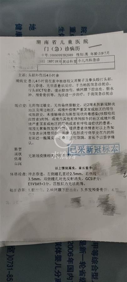 兄弟俩的父亲于8月25日在水滴筹上发起募捐。他称6岁的睿睿和2岁的墨墨受伤严重,一直在重症监护室治疗,医生说治疗需要很长时间。其上传的湖南省儿童医院门诊病历显示,家属自诉墨墨于8月24日下午在家被继祖父用凳和拳头殴打头部,目前昏迷,无明显意识反应。于当地医院急诊就诊,头部CT提示脑挫伤、蛛网膜下腔出血、脑水肿、颅骨骨折等,为求进一步治疗转来该院急诊。而睿睿的CT报告显示,未见颅骨骨折,右侧颞部及左侧颞顶枕部皮下血肿伴积气、软组织挫伤。