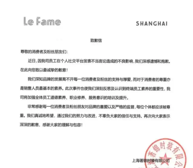 同时,Lefame品牌方还发布了一封致歉信,向消费者及粉丝朋友们表达最诚挚的歉意。信中提到,此次事件使品牌方深刻反思并认识到终端员工素养的重要性,公司将加强全体员工道德素养、职业修养、服务意识的培训及提升,以避免类似事件再次发生。