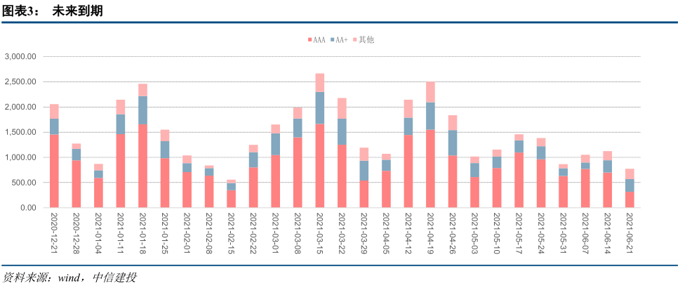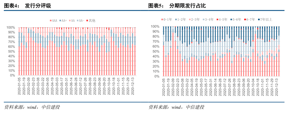 上周(12.14-12.20),发行净融:信用债券一级市场发行量达到2133.73亿元,还款总额2489.80亿元,融资净额-356.07亿元。评级方面,高评级AAA发行占比下降2.5个百分点至62.95%,AA发行占比下降3.5个百分点至18.96%,上周AA发行占比上升5个百分点至16.34%。从期限结构来看,1年内发行金额占比49.02%,上升10个百分点,3-4年发行金额占比18.27%,上升1个百分点,5-6年发行金额占比16.71%,下降3.5个百分点。一级市场发行不振,共延迟或取消债券24只,总额223.7亿元,仍以城市投资为主。本周将有2055.56亿信用债券到期,其中1453.2亿将以AAA评级到期,313.63亿将以AA评级到期。