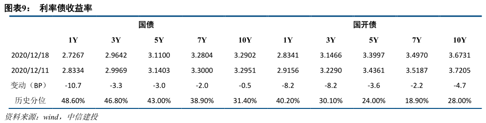 市场流动性观察:上周(12.14-12.20),央行公开市场1500亿元的逆回购和3000亿元的传销到期,央行进行了600亿元的逆回购和9500亿元的传销操作,所以上周净投资5600亿元。本周(12.21-12.27),央行公开市场600亿元逆回购到期。上周MLF过度延续,央行继续关注流动性,中期存款利率受益最直接。上周,DR007下跌1.4个基点至2.1137%;Shibor隔夜上涨29.2个基点至1.7230%。中央经济工作会议明确,宏观政策强调连续性,不急转弯,即边际紧缩,缓慢踩刹车,稳健的货币政策要灵活、精确、合理、适度,对货币紧缩的担忧要适当缓解。