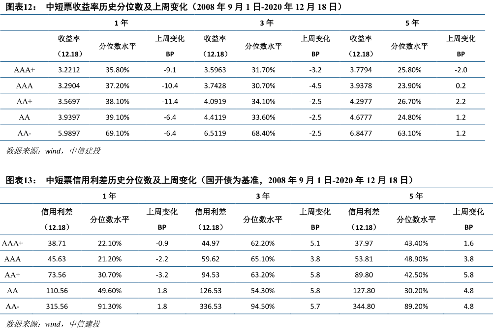根据到期收益率和信用利差:统计局上周二发布的统计数据,第四季度经济复苏依然强劲,抑制了长期收益率的下降趋势。但MLF运营后,资金供应极其充裕,导致空头债券走势良好。本周后半周,资金略有收敛。总体而言,上周1Y国债收益率下跌10.7个基点,10Y国债收益率下跌0.5个基点;1Y CDB下跌了8.2个基点,10Y CDB收益率下跌了4.7个基点。产业债,短久期继续反弹,信用利差方面,1Y中高评级信用利差收敛1-3 BP,低评级被动加宽2bp;3Y,各评级利差加宽4-6bp;5Y,每个评级的利差加宽4-5个基点。就城投债:信用分层明显,信贷息差而言,1Y低点息差扩大了7-12个基点;3Y中高评级利差加宽1-3个基点,低评级加宽6-8个基点;5 Y,中高评级价差扩大3-4,低评级价差扩大6-9 BP。
