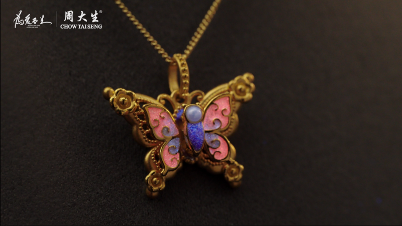 此次主推的艺术珠宝系列【心动蝶舞】,恰是陈慧故事的完美注脚。该款是周大生强化 “黄金珐琅 + 工艺创新” 心智的代表产品,以莫奈画作中蝴蝶穿梭花海的姿态为原型,用粉紫渐变珐琅呼应印象派光影感,搭配荧光珐琅和闪动工艺,吸收光线后在暗处呈现柔和荧光,实现动态+发光的双重效果。