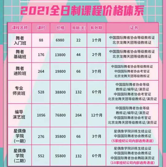 培训结束后,上述工作人员表示,将发放学员的明星偶像学院结业证书、教练证书或中国国际舞蹈家协会舞蹈员证书,并享受五家以上经纪公司的内部选秀渠道。