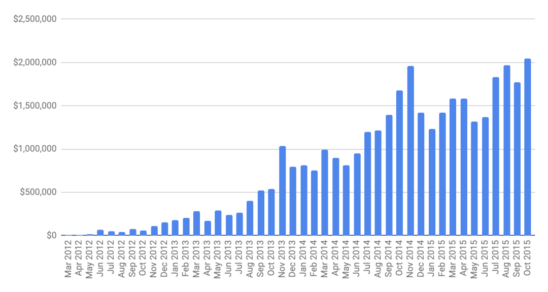 尽管如此,实际增长情况仍然不容乐观。2015年全年的数据不仅没有看到明显的增长,甚至有几个月有所下降。之前10亿美元的愿景会变成泡沫,他们绕不过b。