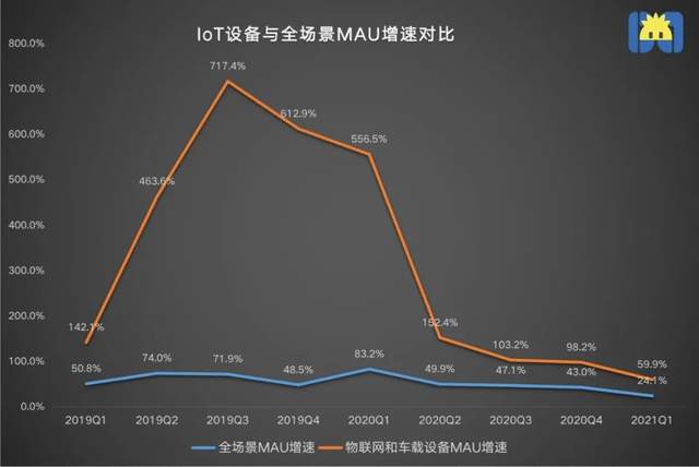 但我们来仔细拆解下这组数据,就会发现形势并不乐观。上述1.46亿里,9770万月活来自第三方应用,剩下的4830万才是物联网和车载设备月活用户,也就是说,截至2021Q1,MAU的“含loT率”为19%。而且近两年,IoT设备的MAU增速呈减缓趋势。