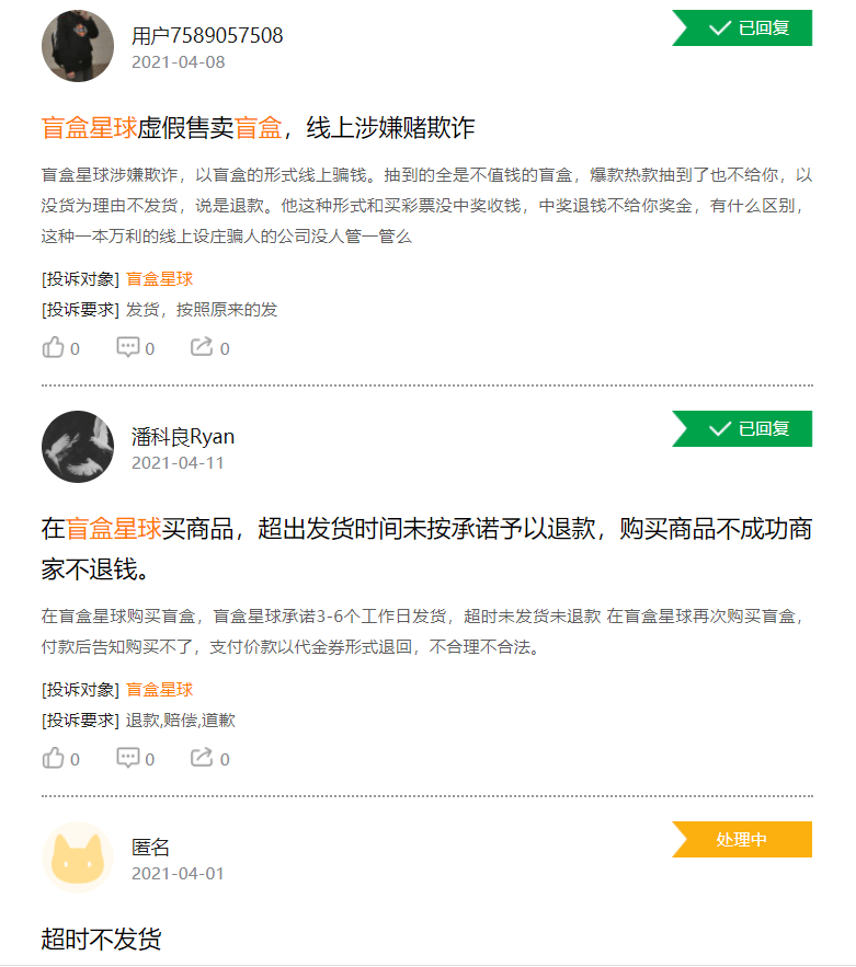 黑猫投诉上用户对盲盒星球的质疑,图源黑猫投诉