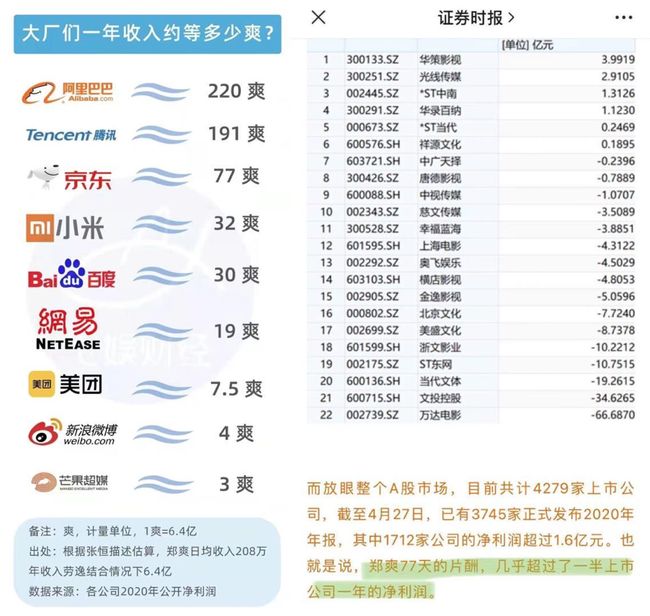 以郑爽进组77天拍摄期计算,日薪则高达208万(精确数字:207.79万)元。那么郑爽的日薪等同于年薪200万的人一年的薪资,当然,这还是在208万抹零的情况下,纵观整个A股市场,目前共计4279家公司,截至4月27日,有1712家公司的净利润超过1.6亿,那么郑爽77天的片酬,几乎超过了一半上市公司一年的净利润,而全国最会赚钱的阿里巴巴也仅相当于220爽。
