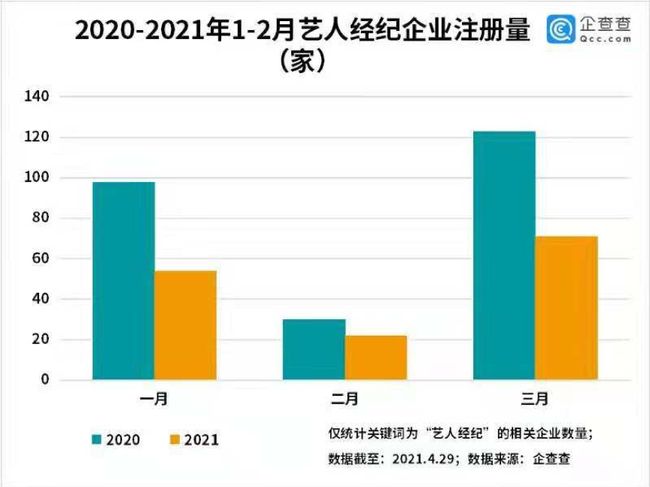 数据显示,我国在业存续“艺人经纪”相关企业1.08万家,2020年新增1138家,同比减少55%,2021年一季度新增147家,同比减少41%。