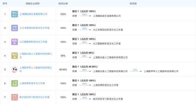 上海噶咕娱乐发展有限公司、九江羊群效应影视文化工作室、九江酷酷熊影视文化工作室、新沂影视文化工作室、上海郑爽影视文化工作室、新沂熊大熊二影视文化工作室、上海跳耀影视文化工作室,郑爽均为100%持股。其余公司除上海鲸乖乖人工智能科技有限公司外,郑爽均占据60%以上股权。