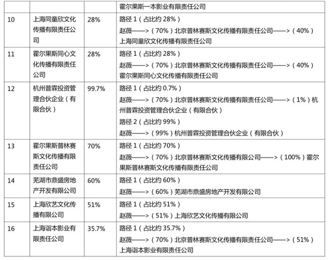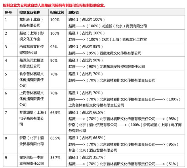 普林赛斯成立于2002年11月,法定代表人魏启颖,注册资本300万人民币,该公司最大股东为赵薇,持股比例70%。龙旭新成立于2011年9月,法定代表人魏启颖,注册资本50万人民币,该公司由赵薇全资持股。易聚创意则成立于2014年11月,法定代表人杨建平,注册资本126万人民币,赵薇在该公司持股10%。