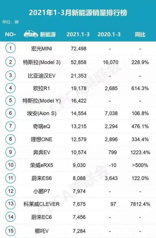 2020年,魏玛直接跌至前四。魏玛在协会更新的2021年第一季度新能源汽车销量排行榜前15款车型中未见。取而代之的是72,498款低端车型,洪光MINI,以及销量遥遥领先的高端特斯拉、威来和理想。