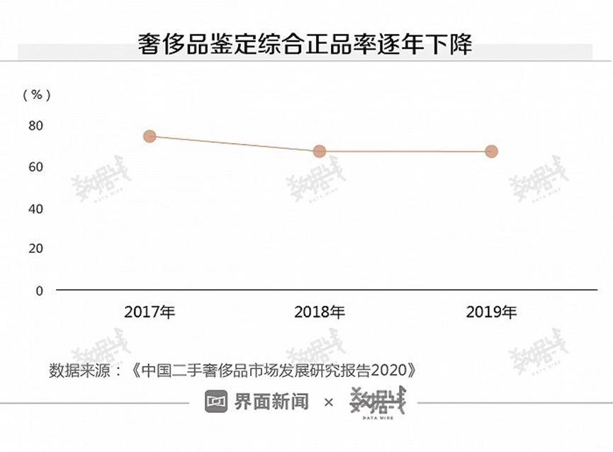 奢侈品流通中有多少假货?客观数据也许能告诉我们答案。据悉,2016年,在海外购买的奢侈品中,约有60%是假货。《中国二手奢侈品市场发展研究报告 2020》显示,2017年所有优于奢侈品、易拍的商品中,只有30%是正品,正品率逐年下降。到2019年,综合真实率为33.6%,比三年前下降4个百分点。