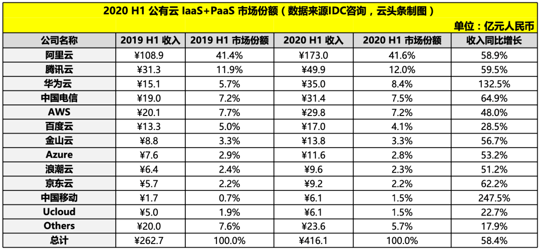 IDC发布的《中国公有云服务市场(2020H1)跟踪报告》显示,头部云厂商的营收增速集中在50%以上,但中小云厂商的营收增速在20%左右。