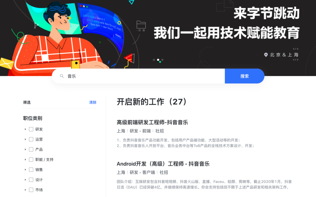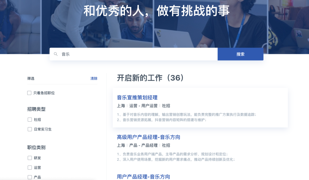 在字节跳动招聘官网上,正不断有音乐岗位需求放出。一周前,仅上海,音乐相关岗位有27个,4月19日,这一数字变成36个。主要包括音乐宣推策划经理、用户产品经理、音乐人运营、音乐活动策划、音乐中台产品经理、音乐战略经理等。