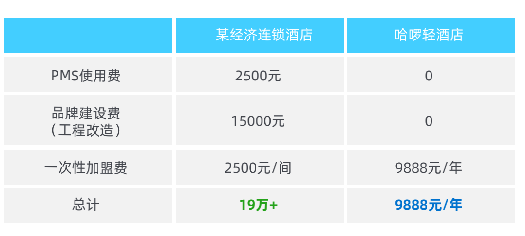 哈啰轻酒店加盟有两种形式,一种是现金加盟,即每年支付9888元的品牌使用费,以及5000元的服务保证金,另外一种则是“现金+置换房”模式。相比于连锁酒店的运营成本,哈啰轻酒店在短时间内更加划算,运营风险较低。