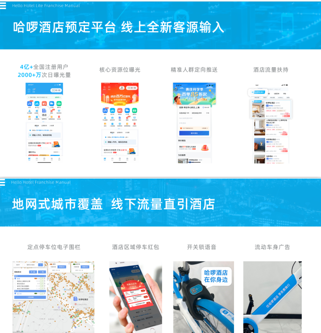 加盟后,原店名统一更该为“哈啰小旅馆(后期升级为“哈啰轻酒店”)”或“哈啰酒店”,并附上分店名字,且享受线上基于超4亿注册用户的哈啰出行App+线下组合的引流服务。