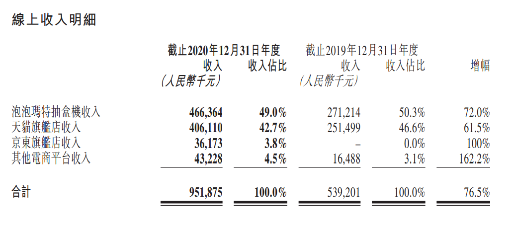 从贡献收入的具体渠道来看,2019年在线渠道收入为5.39亿,2020年为9.52亿,收入增长率为76.5%。相对于零售店收入的39.9%,线上渠道的收入几乎等于线下零售店的收入。