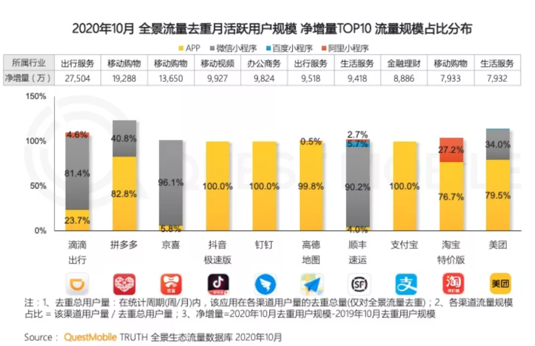根据Questmobile报告,去年10月,拼多多月活用户中,微信小程序用户量在去重总用户量中占比为40.8%,京喜则更为夸张,微信小程序用户量在其去重总用户量中占比达到96.1%,显然,微信小程序已成为电商获客和维持粘性的重要渠道。
