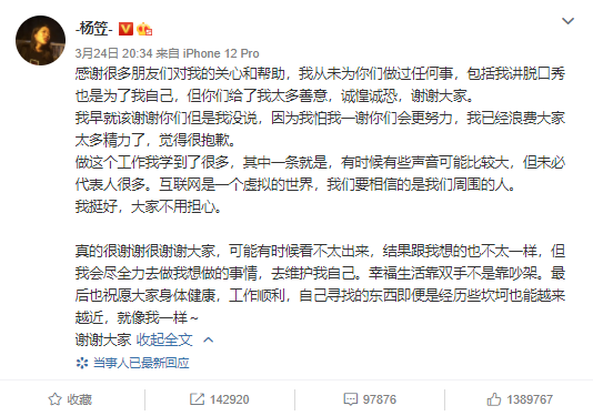 事情已经发生两天了,但是越来越糟。此前有传言称,杨莉本应在24日参加P&G电商直播,但因舆论争议被撤。当天晚上,杨莉作为主持人出现在直播室,直播期间看了超过一百万人。很多网友通过购买截图来表示对杨莉的支持。直播结束后,杨澜回应道:“谢谢大家的关心。我会尽我所能做我想做的事,保护好自己。”