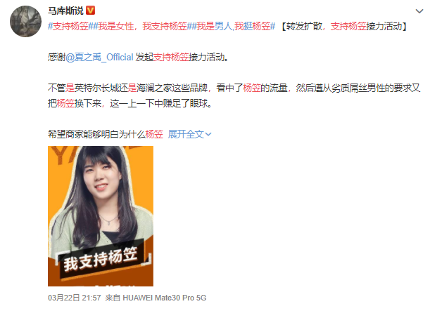 当网友们吵起来的时候,一位说唱歌手夏志宇发起了“我是男人,我支持杨莉”的话题活动,吸引了众多网友自发接力,表示支持杨莉代言的任何品牌,不歧视女性。