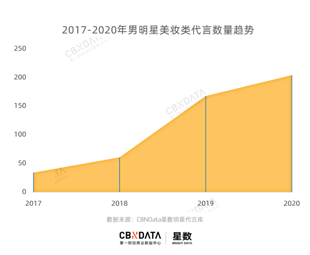 “其他经济”和“其他经济”的快速增长,让品牌方看到了更多的合作可能性。在美容类,男明星代言已经成为一种流行趋势。据CBNData明星数统计,从2018年开始,美妆类男明星的代言数量大幅增加,甚至超过女演员的代言。