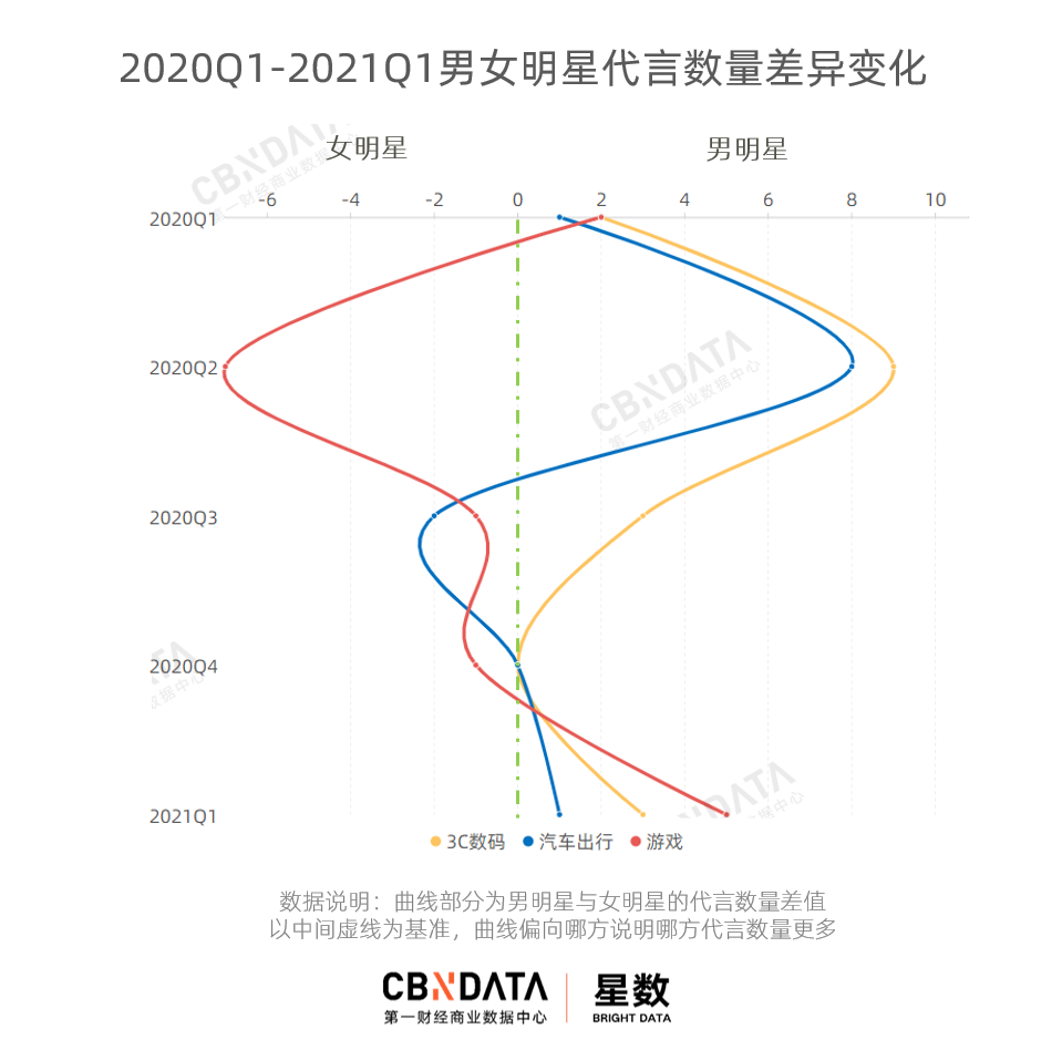从图中可以看出,在2020年的Q1和Q2,3C数码和汽车旅行的男女明星存在明显差异,男性明星更占主导地位,但在游戏领域,女性明星的数量多于男性明星。在Q2季之后,两次代言之间的差距逐渐缩小,这位女明星的汽车旅行和数字代言有所增加,一度实现了超越。