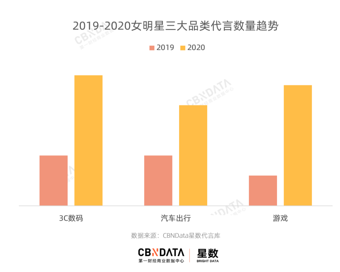 对比2019年和2020年三大类女明星的代言数量,基本翻了一番。在3C计算机领域,杨莉被批评为“更多的男性消费者”,2020年将迎来更多的女性代言人。