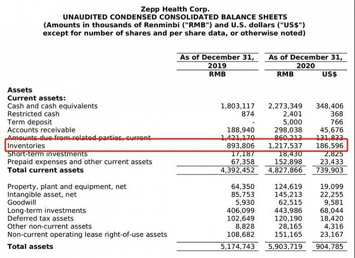 有意思的是,在华米的资产负债表中就有库存这一项,这一项的数字在2019年是8.93亿,在2020年高达12.18亿。