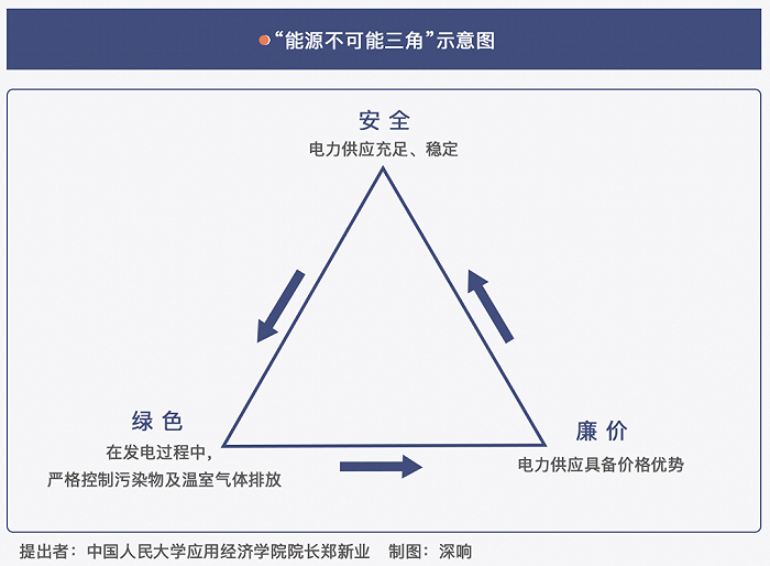 中国人民大学应用经济学院院长郑新野曾在2016年提出“能源不可能三位一体”——安全、绿色、廉价,即在一定程度上难以同时保证“能源充足、无污染、廉价”。